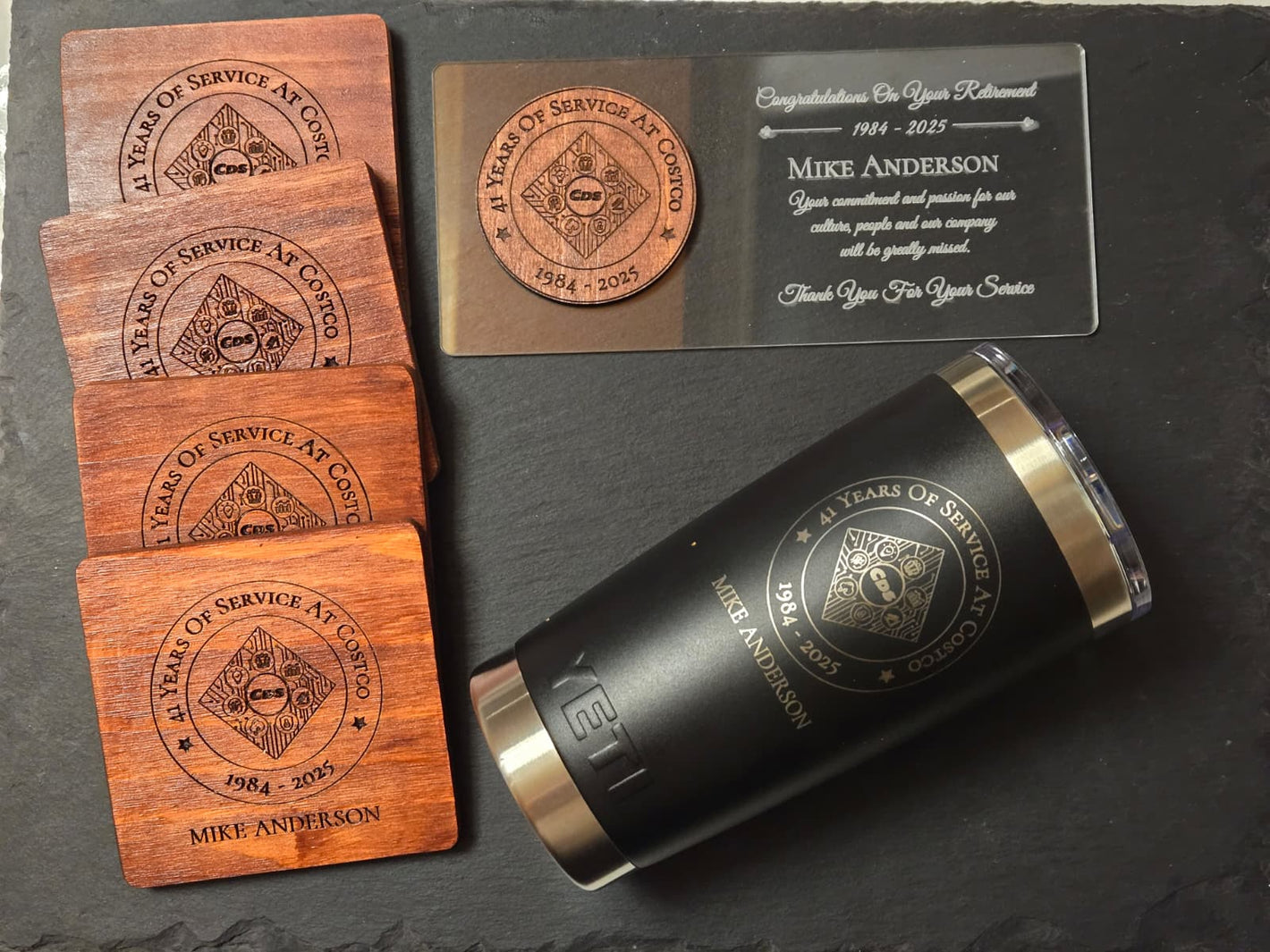 Engraved Table Top Gift Set with Yeti Rambler, stained and finished wooden coasters and engraved acrylic plaque as a specialty gift for a retiring member.
