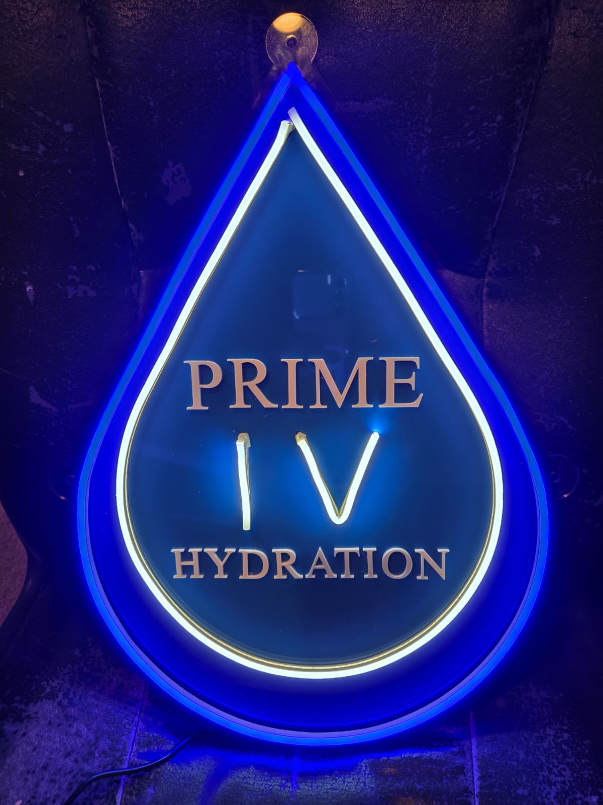 Specialized Neon Sign made for Prime IV Hydration using layered acrylic in the water droplet shape