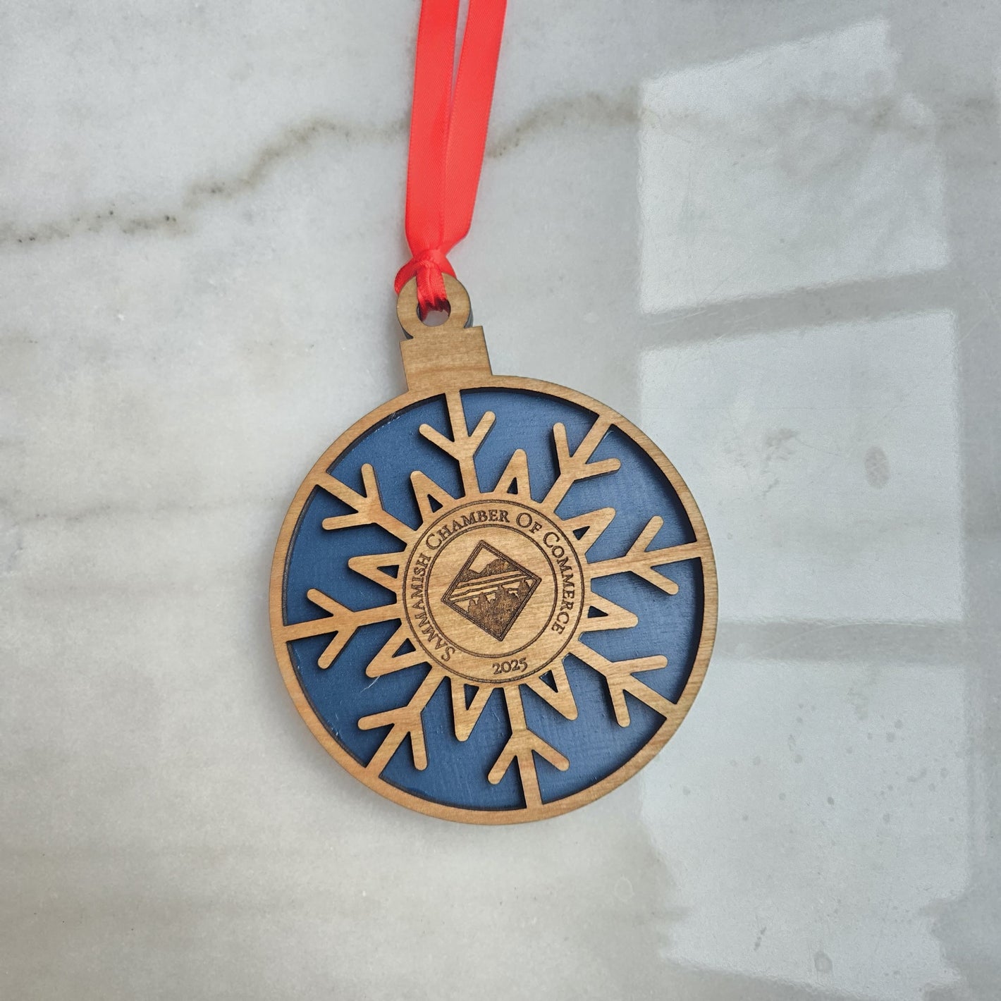 Specially designed, layered wood Logo ornament